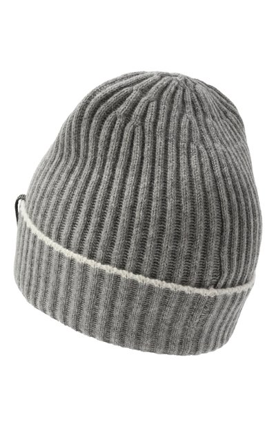 Шапку бини выполнили ребристой вязкой из кашемира. Широкий отворот с каймой по краю дополнили петлей из фирменных цепочек мониль.