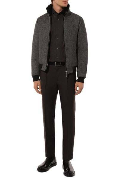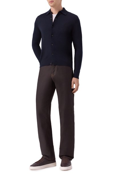 Рубашку с отложным воротником выполнили из трикотажа на основе мериносовой шерсти. Модель со смещенными назад плечевыми швами и небольшими разрезами по бокам застегивается роговыми пуговицами.