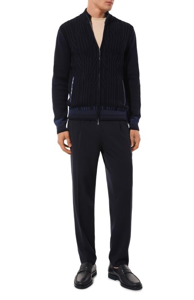 Брюки с защипами, переходящими в отутюженные стрелки, выполнили из шерстяной ткани с добавлением полиэстера. Модель с двумя карманами по бокам и парой листочек сзади дополнили эластичным поясом-кулиской.