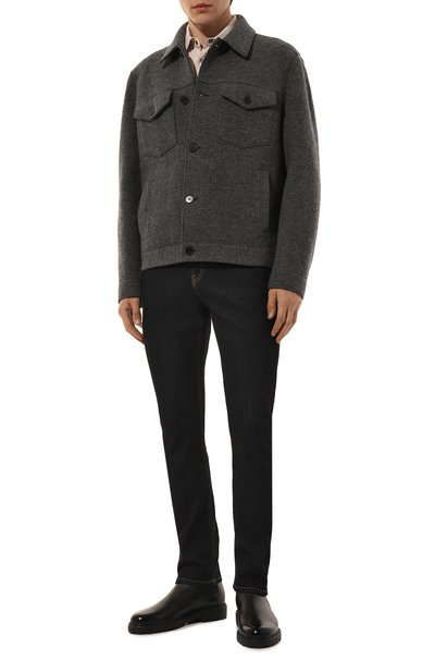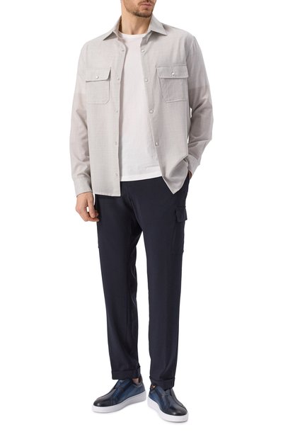 Рубашку с супатной застежкой выполнили из стрейчевой шерсти с добавлением полиэстера. Модель с прямоугольными манжетами и нагрудными карманами с клапанами украсили фирменной съемной эмблемой на воротнике.
