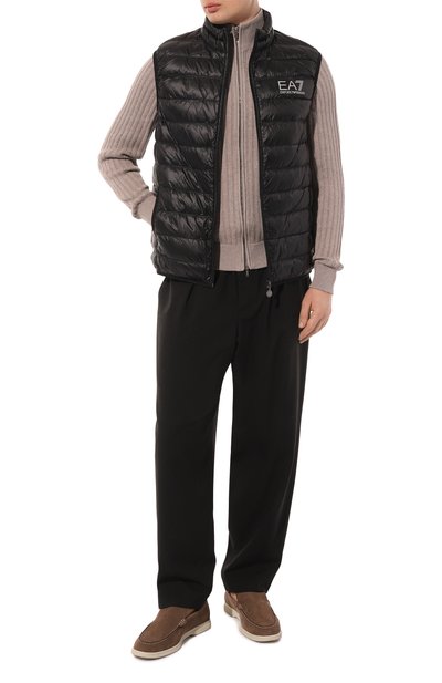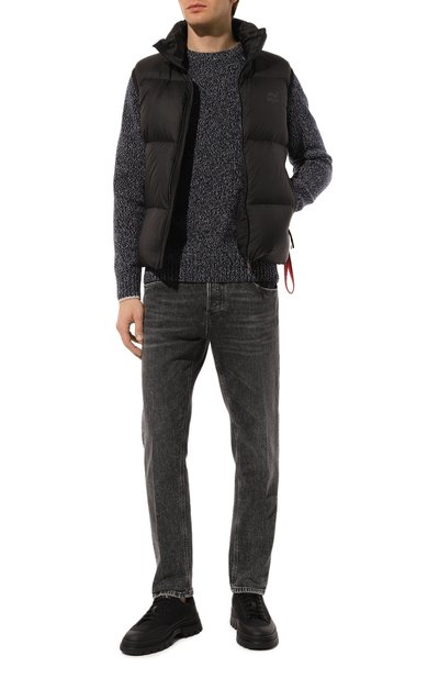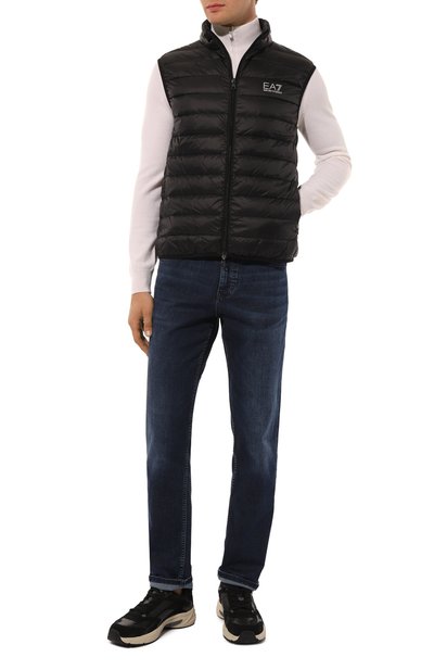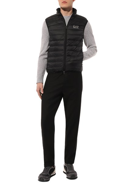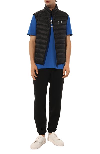Стеганый жилет с воротником-стойкой выполнили из жатого глянцевого и матового нейлона. Утепленную синтепоном модель дополнили внутренними, двумя внешними и нагрудным карманами, один из которых украсили фирменным патчем Frecce Tricolori.