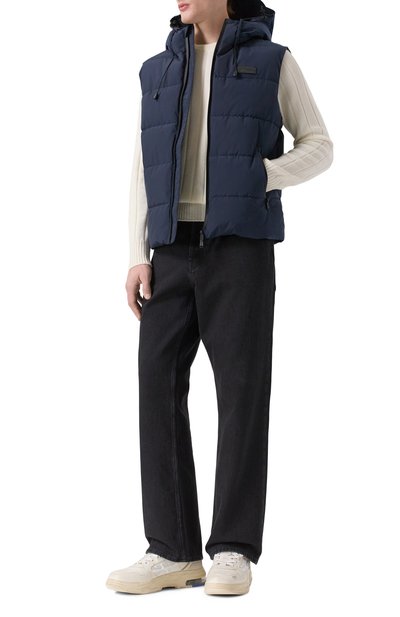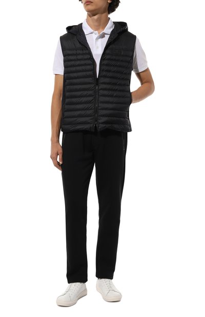Стеганый жилет на синтетическом утеплителе выполнили из жатого нейлона. Модель с воротником-стойкой, эластичными проймами и низом дополнили боковыми карманами с молниями и нагрудным с потайной застежкой, декорированным термонаклейкой с символикой пилотажной группы Frecce Tricolori.
