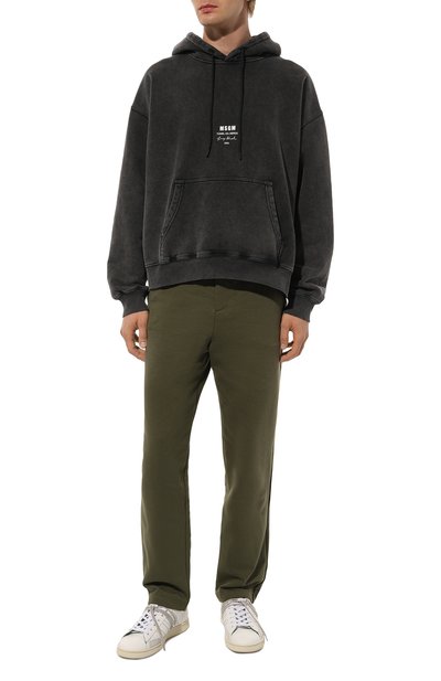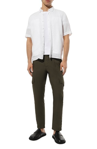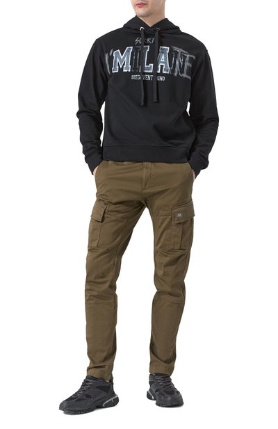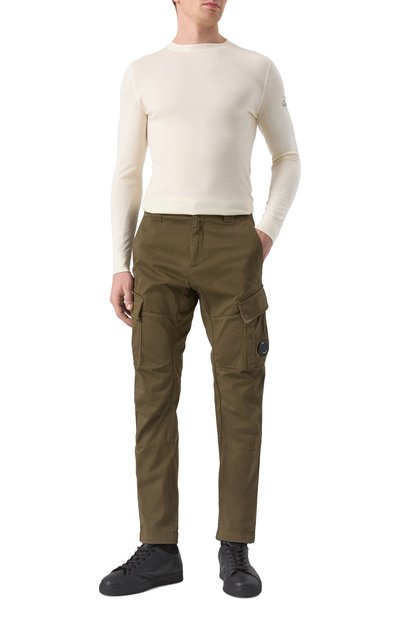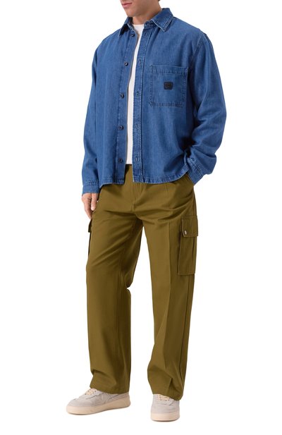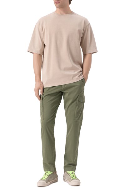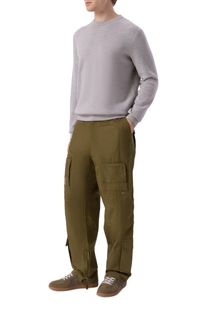 Брюки с золотистой эмблемой ВВС Италии спереди выполнили из стрейчевого хлопкового габардина. Окрашенную в готовом виде модель дополнили боковыми карманами, задними с клапанами и парой карго, на одном из которых вышит логотип марки.