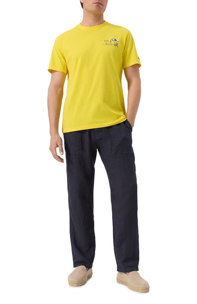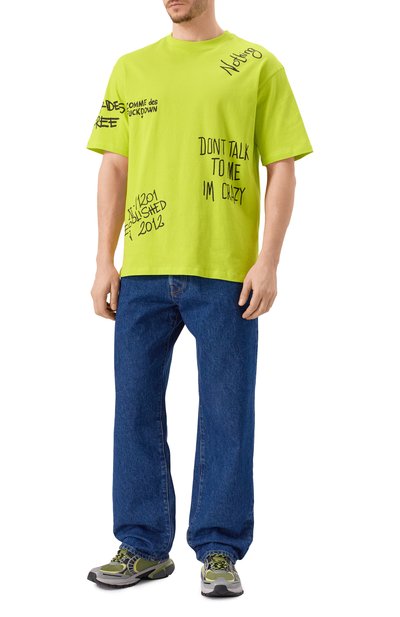 Футболку оттенка Gold Flake Yellow выполнили из хлопкового джерси. Модель с кругло й горловиной украсили вышитой эмблемой, отсылающей к символике итальянских ВВС.