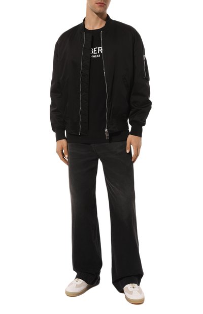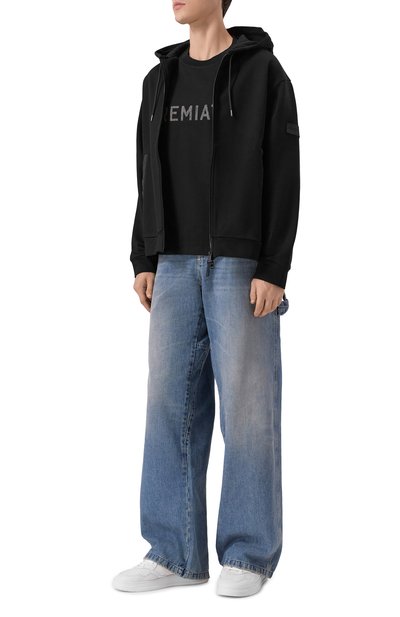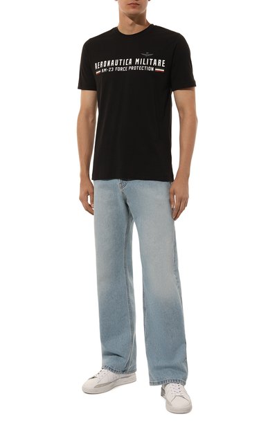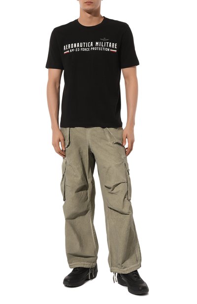 Футболку прямого кроя выполнили из чистого хлопка. Спереди модель декорировали логотипом с надписью AM-23 Force Protection, итальянскими флагами и вышитой эмблемой ВВС Италии.