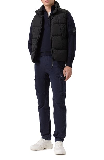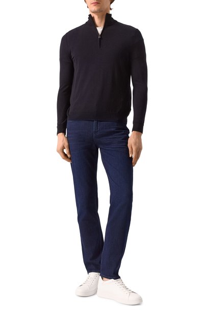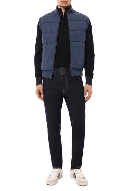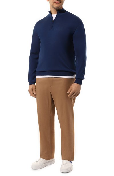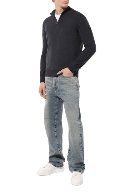 Джемпер выполнили из шерстяного трикотажа. Эластичные манжеты, пояс и воротник-стойку подчеркнули контрастным кантом. Модель с вышитой эмблемой марки застегивается молнией.