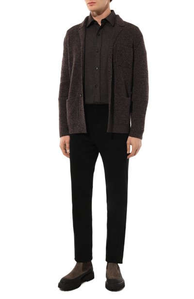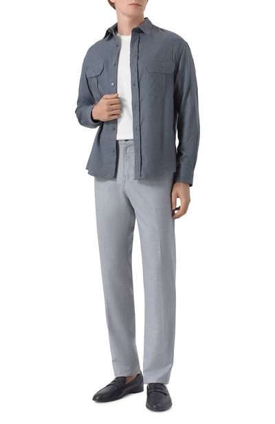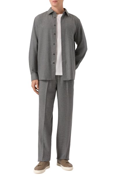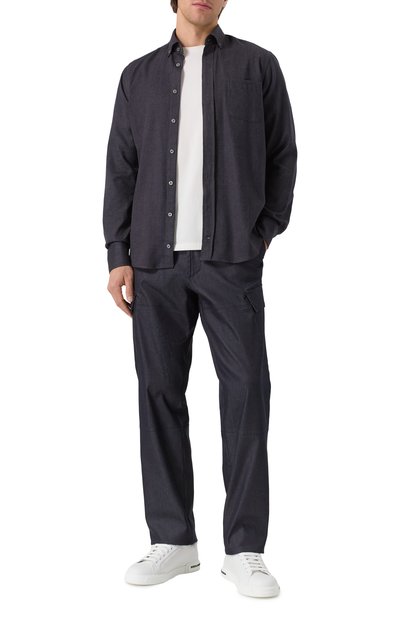 Рубашку с фигурным низом и закругленными манжетами выполнили из хлопковой фланели с добавлением кашемира. Модель застегивается пуговицами из натурального перламутра.