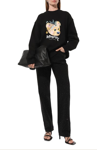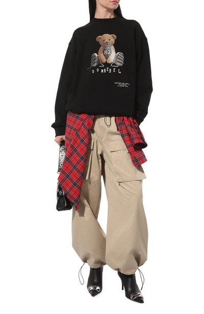 Свитшот из хлопкового трикотажа украсили акцентным брендированным принтом фирменного алого оттенка. Модель с рукавами реглан дополнили эластичными манжетами и поясом, а под горловиной разместили треугольную вставку.