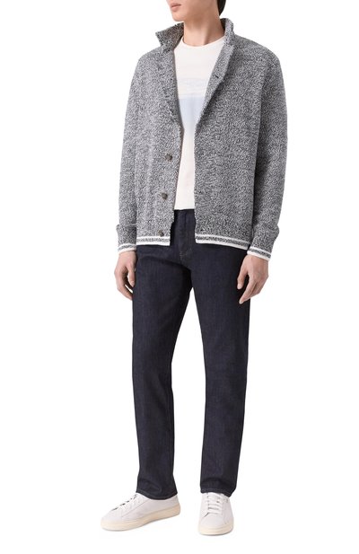 Кардиган со слегка спущенной линией плеч выполнили фактурной вязкой из меланжевой шерстяной пряжи. Спереди изделие дополнили брендированной пластиной.