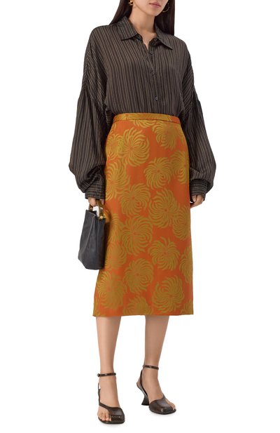 Миди-юбка с узким поясом и высокой шлицей сшита из микса ацетата и вискозы с цветочным принтом. Модель, застегивающаяся потайной молнией сзади, удачно дополнит повседневный гардероб.