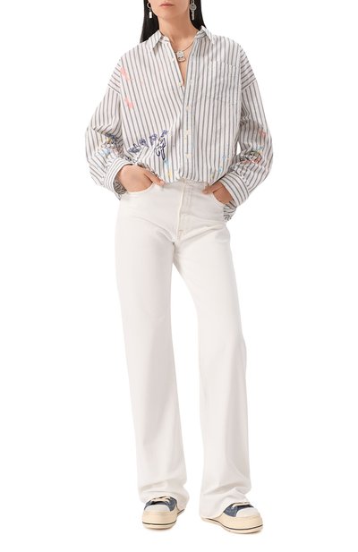 Рубашку свободного кроя сшили из хлопкового поплина в полоску. Модель со спущенной линией плеч и закругленным подолом станет основой образов разной степени сложности.