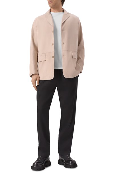 Для пошива куртки с тремя накладными карманами и отложным воротником использовали плотный хлопок. Модель прямого кроя застегивается крупными пуговицами.
