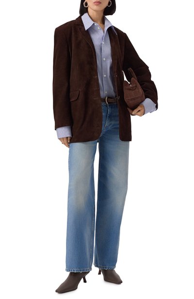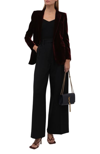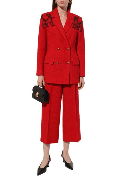 Для изготовления жакета с застежкой на потайной крючок и шлицей сзади использовали габардин из шерсти первого пострига. Модель на брендированном вискозном подкладе дополнили нагрудным карманом с листочкой и боковыми с клапанами.