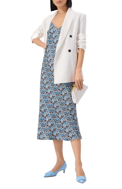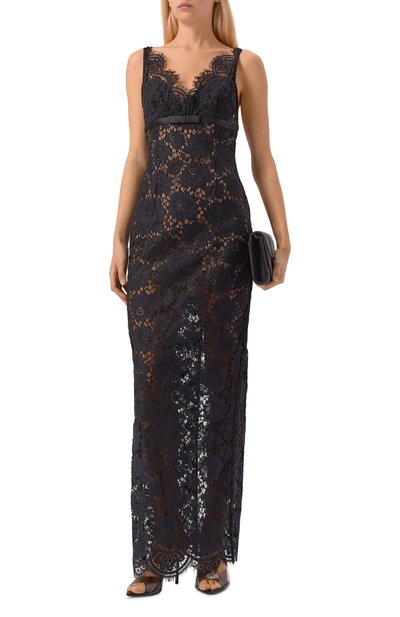 Платье с рифлеными горловиной и проймами выполнили из хлопка супима. Модель с ажурным и волнообразным узором дополнили лентами, завязывающимися на глубоком вырезе сзади.