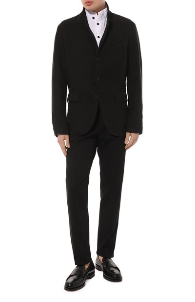 Однобортный пиджак выполнили без подклада из трикотажа на основе тонкой мериносовой шерсти super fine. Мо дель с двумя шлицами дополнили прорезным нагрудным карманом и накладными боковыми.