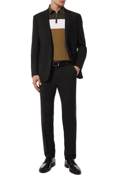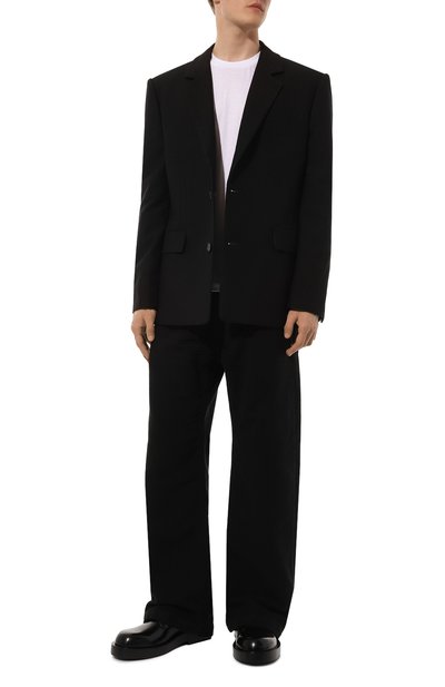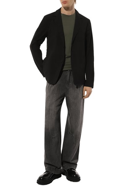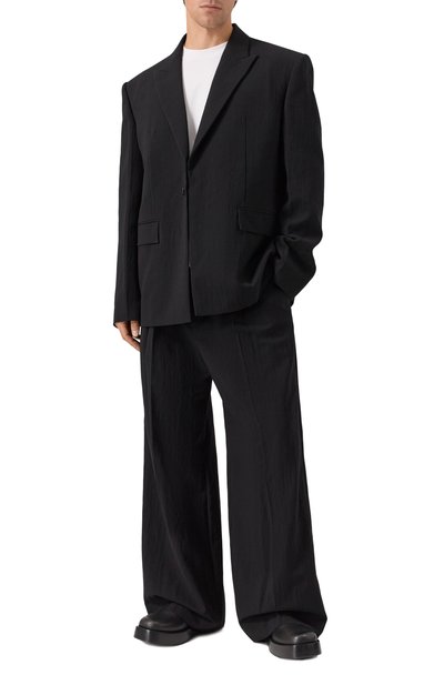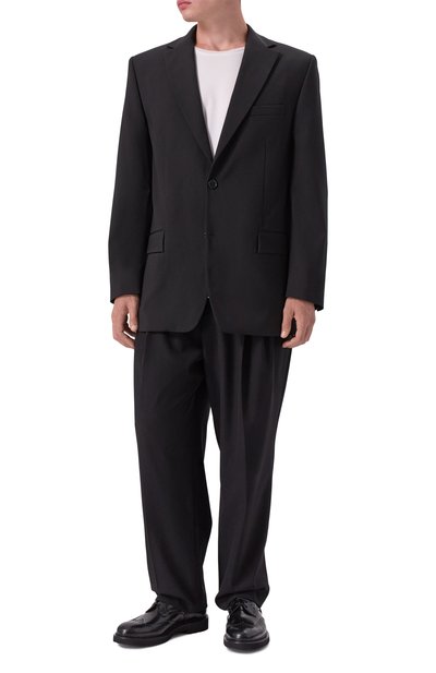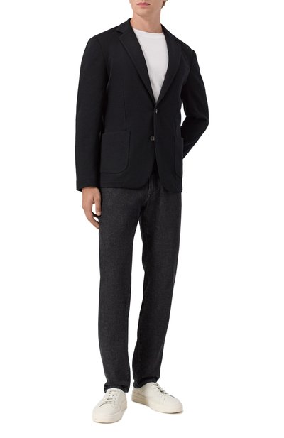Однобортный пиджак выполнили без подклада из трикотажа на основе тонкой мериносовой шерсти super fine. Модель с двумя шлицами дополнили прорезным нагрудным карманом и накладными боковыми.