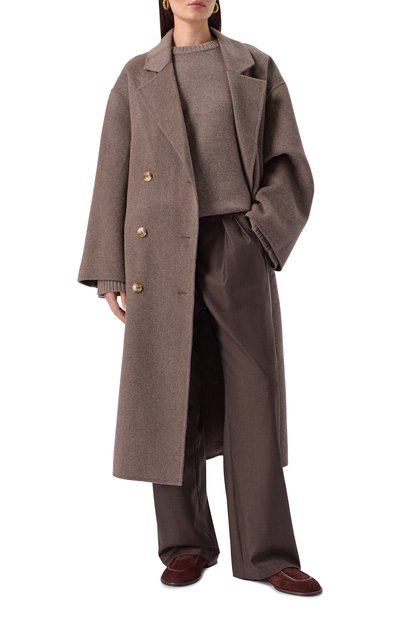 Двубортное пальто с крупными золотистыми пуговицами выполнили без подклада из легкого фетра на основе шерсти первого пострига. Модель с длинным разрезом и широким хлястиком сзади дополнили боковыми карманами.