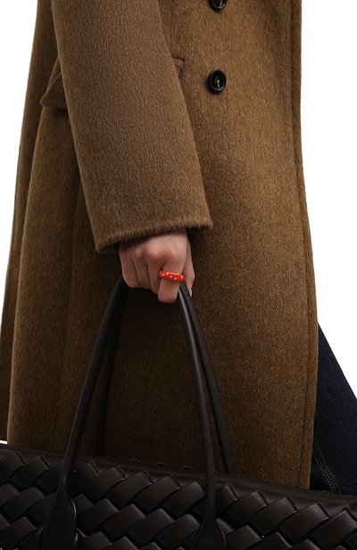 Незамкнутое витое кольцо выполнили из серебра 925-й пробы и двухцветной керамики. На одном конце скульптурную деталь украсили вставкой из стекла.