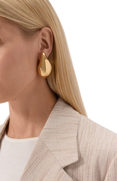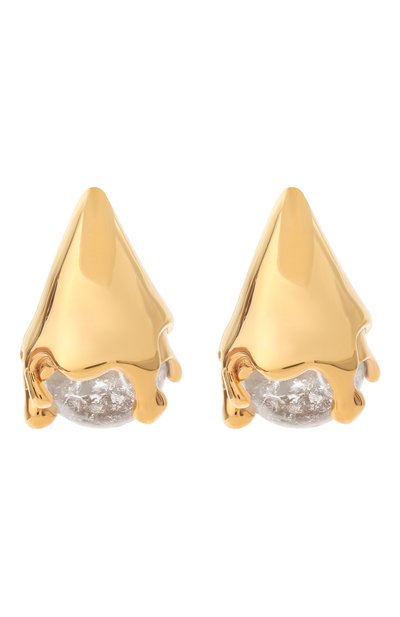 Пусеты в форме капли выполнили из стерлингового серебра с гальваническим покрытием 18-каратным золотом. Серьги украсили вставками из прозрачного горного хрусталя.