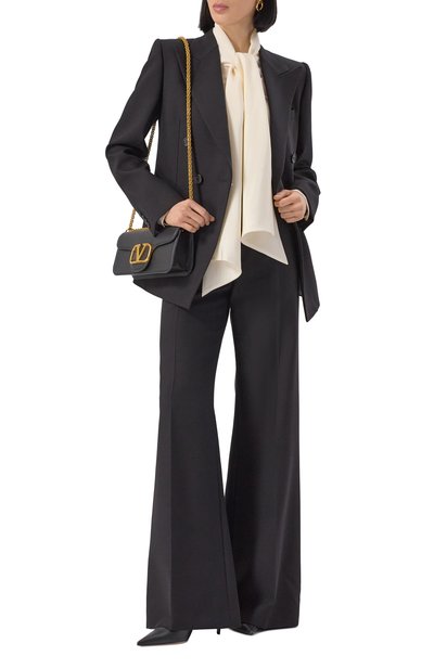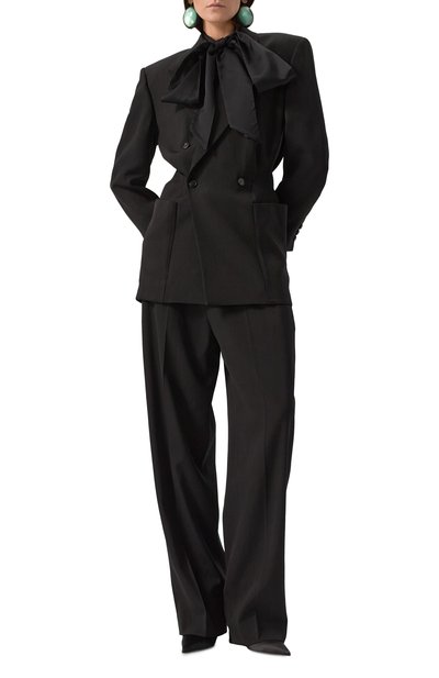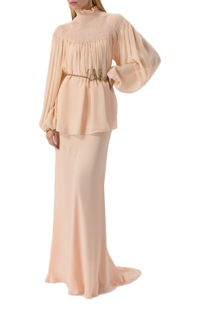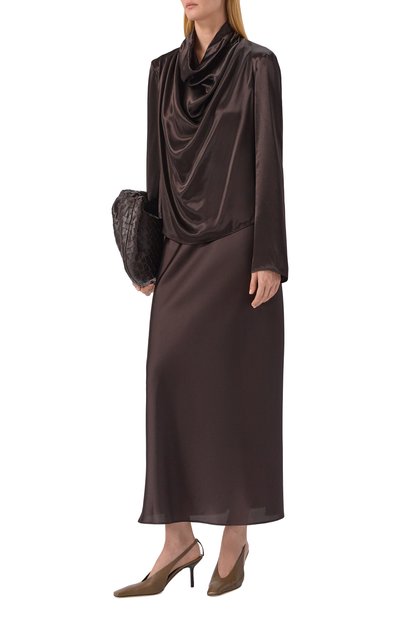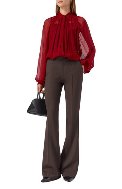 Для создания блузы с супатной застежкой выбрали жатый шифон из чистого шелка. Спереди и сзади под отложным воротником сформировали множество складок.