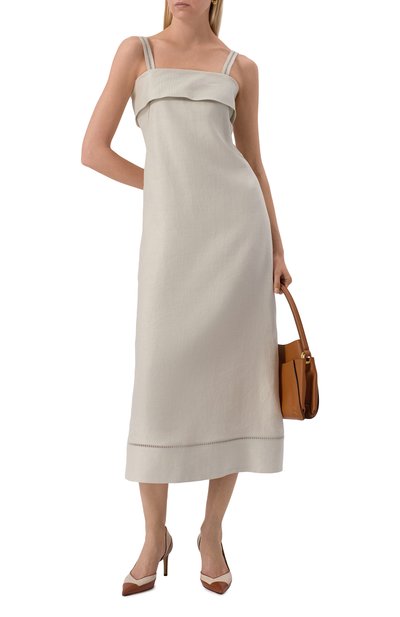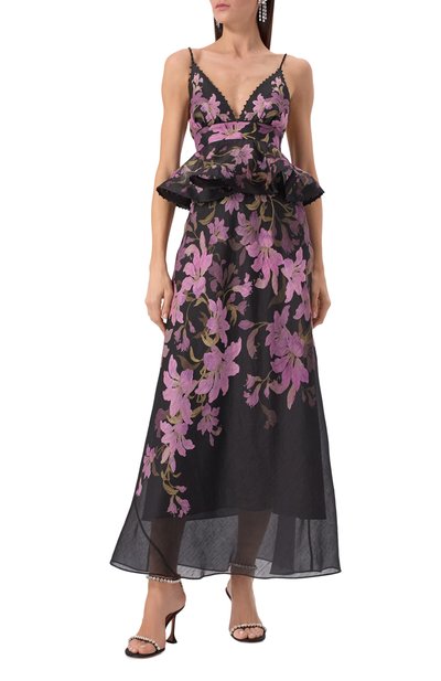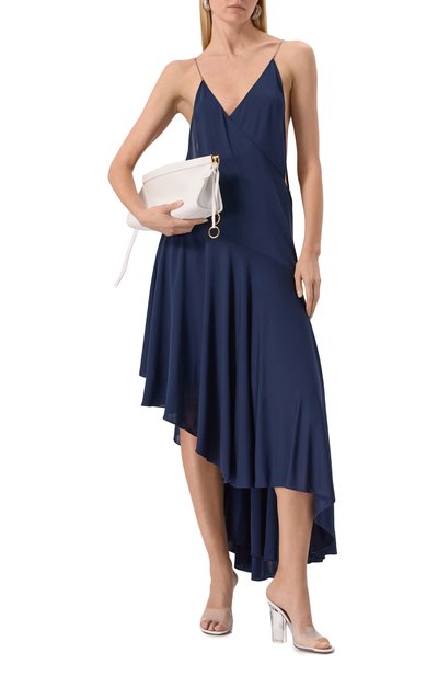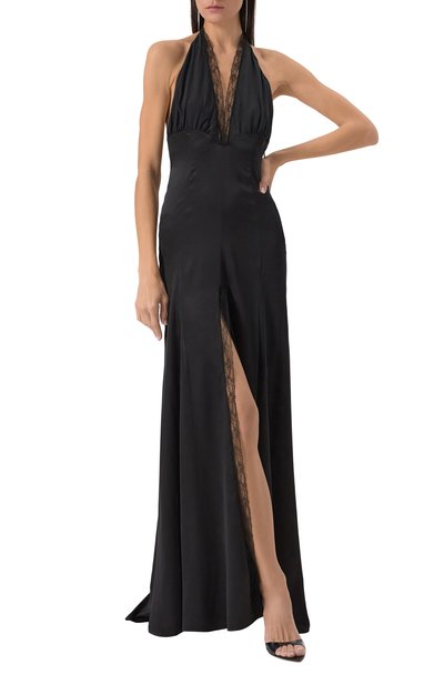 Для пошива длинного платья с ассиметричным подолом использовали гладкий шелк. Лиф изделия с бретелью-халтер украсили драпировками. Модель застегивается потайной молнией сзади.
