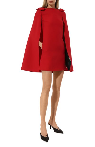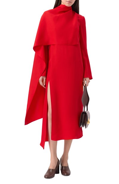 Миди-платье с запахом, глубоким V-образным вырезом и рукавами «летучая мышь» выполнили из гладкого шелка. Модель с потайной застежкой на кнопку и разрезом спереди дополнили боковыми карманами.