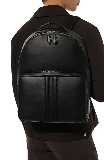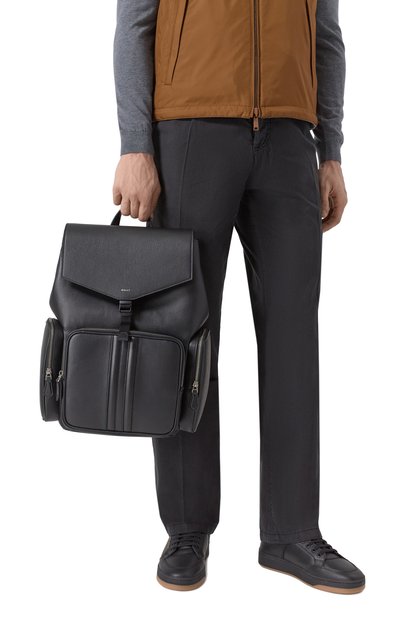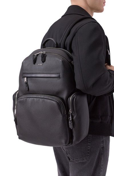 Рюкзак с плотной спинкой выполнили из крупнозернистой кожи, а подклад – из текстиля фирменного оттенка Golden Cream. Модель дополнили внешним и парой внутренних карманов, а также отделением для ноутбука.
