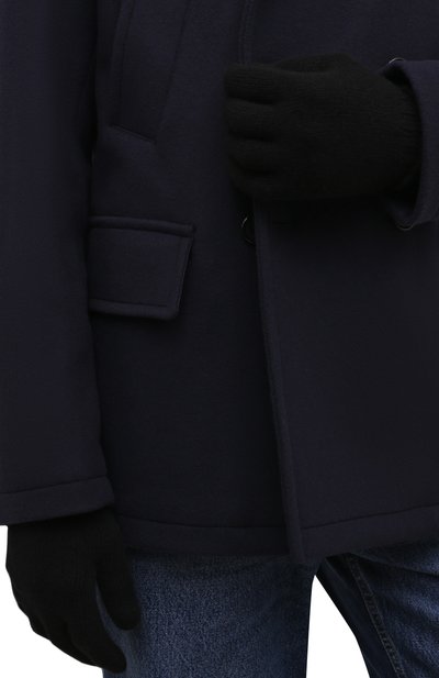 Перчатки с широкой манжетой в рубчик связали из микса шерсти и акрила. Тыльную сторону аксессуара декорировали контрастным логотипом марки.