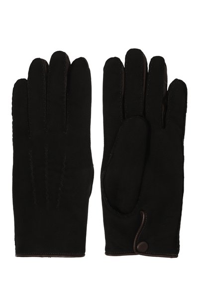 Перчатки с тройным швом на тыльной стороне изготовили вручную из тонкой замши, предусмотрев шерстяной подклад. Аксессуар с небольшим разрезом на манжете украсили тисненым логотипом.