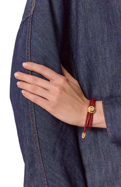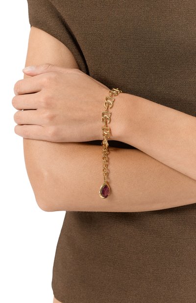 Регулируемый браслет-цепочку с застежкой-крючком выполнили из латуни с золотистым финишем. Каждое звено декорировали гранеными вставка ми из полимерной смолы.