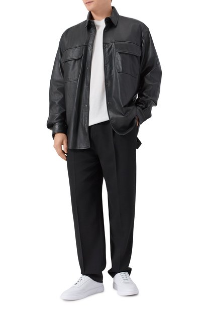 Широкие брюки с двумя парами карманов выполнили из стрейчевого твила на основе шерсти и полиэстера. В кулиску на поясе продели текстильную регулируемую ленту с брендированной пряжкой.