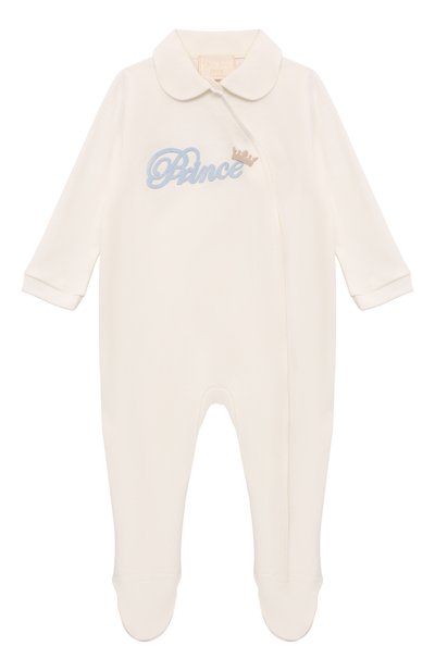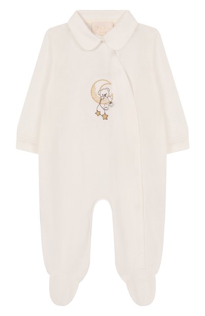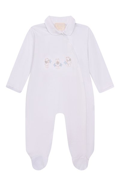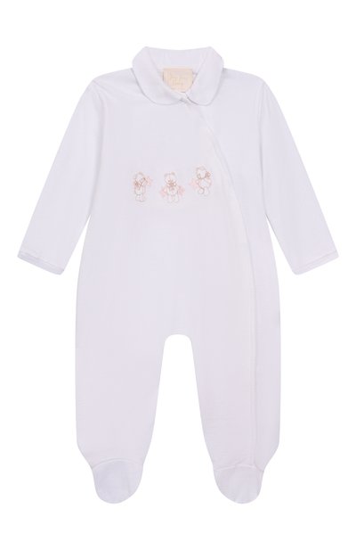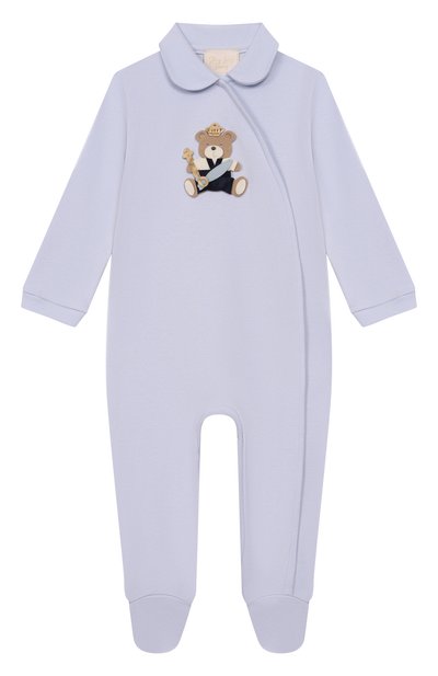 Комбинезон с диагональной застежкой и пинетками выполнили из хлопка. Спереди модель украсили аппликацией. В комплекте — шапка с атласным бантом.