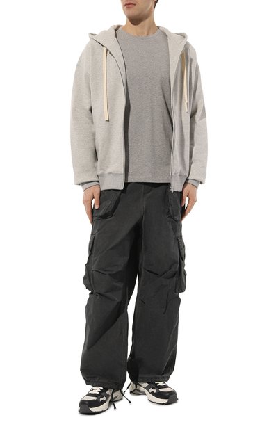 Футболку прямого кроя выполнили из стрейчевого джерси на основе хлопка. Спереди модель с круглым вырезом декорировали логотипом, продублированным строчкой в тон.