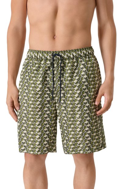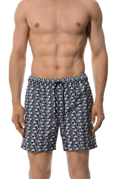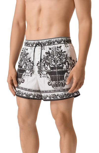 Плавки-шорты с принтом Majolica выполнили из быстросохнущего полиэстера. Модель с сетчатым подкладом и регулируемым эластичным поясом-кулиской дополнили боковыми карманами и задним с молнией и брендированным патчем.