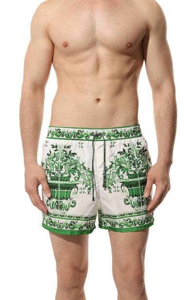 Плавки-шорты с принтом Majolica выполнили из быстросохнущего полиэстера. Модель с сетчатым подкладом и регулируемым эластичным поясом-кулиской дополнили боковыми карманами и задним с молнией и брендированным патч ем.