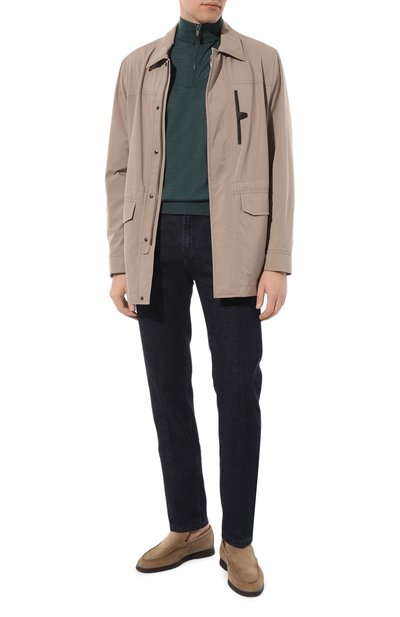 Для создания джемпера с эластичными манжетами и поясом использовали тонкий трикотаж из мериносовой шерсти с волокнами толщиной 13,5 микрон. Высокая горловина модели застегивается молнией.