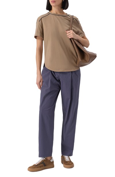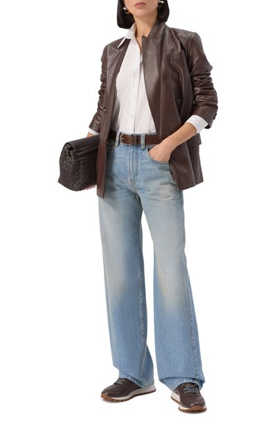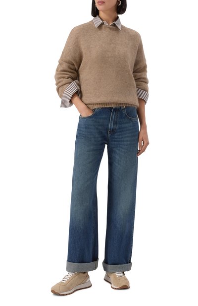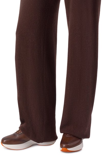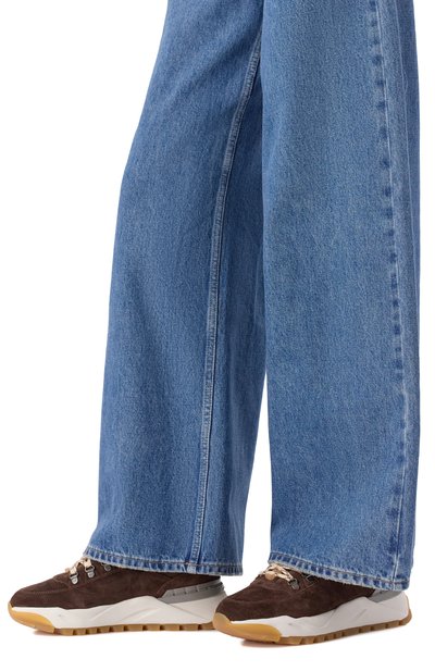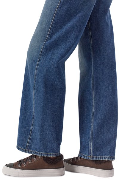 Кроссовки с внутренней отделкой из меха ягненка выполнили из телячьей замши. Шнуровку подчеркнули петлями из фирменной цепочки мониль, а задник укрепили контрастной брендированной накладкой.