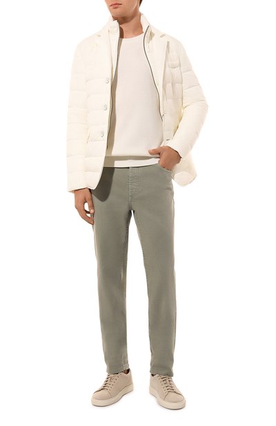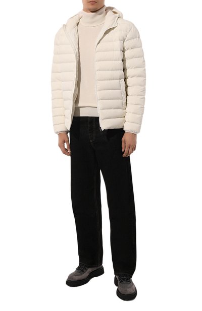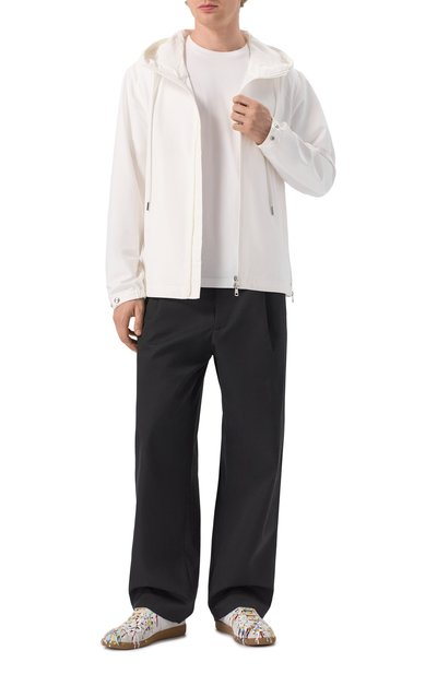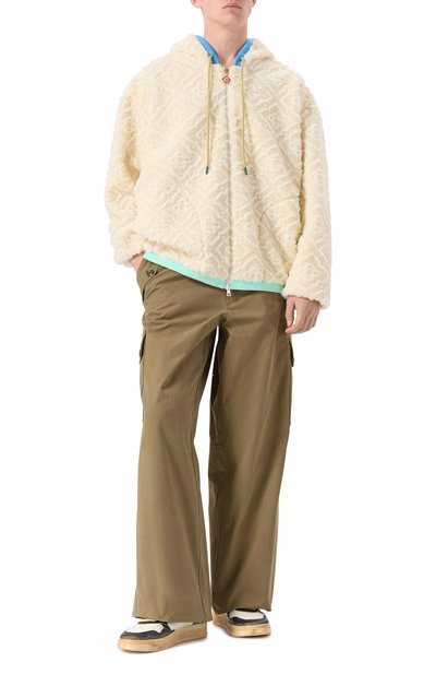 Куртку с двумя карманами сшили из флиса с брендированным фактурным узором. Регулируемый капюшон и нижнюю кромку отделали контрастной каймой. Модель застегивается встречной молнией.