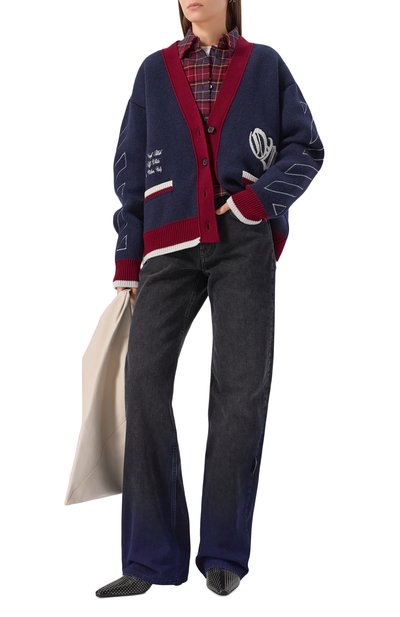 Кардиган с двумя боковыми карманами выполнили из трикотажа на основе мериносовой шерсти с добавлением кашемира. Спереди и сзади модель с контрастной каймой украсили мотивом Casa Mountain Temple.