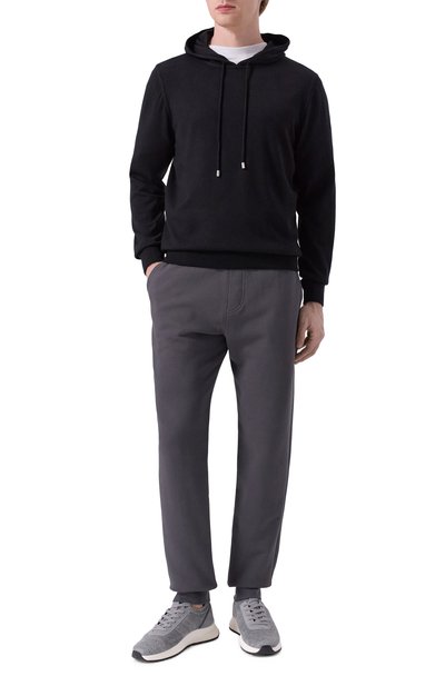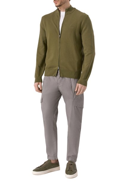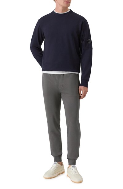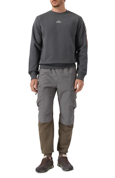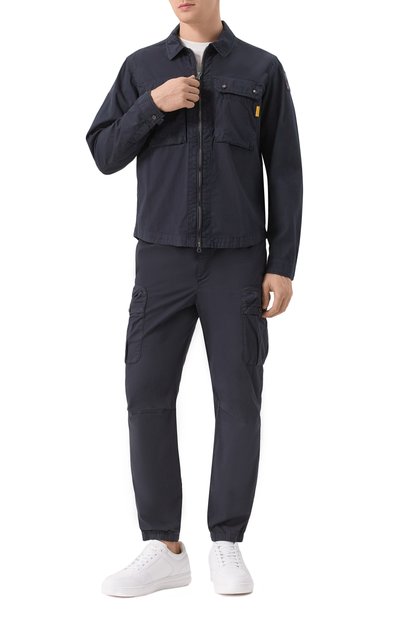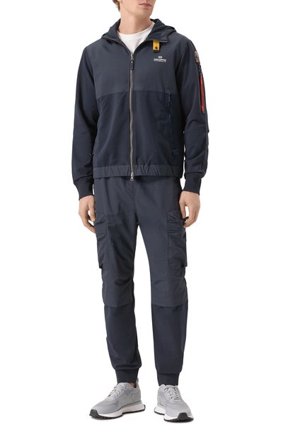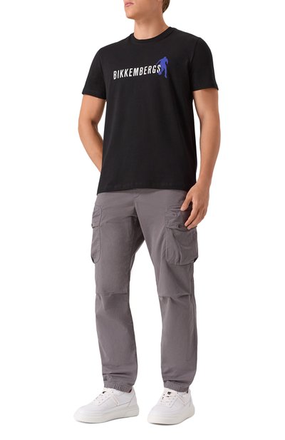 Джоггеры с регулируемым поясом-кулиской выполнили из полиэстерового материала с разной фактурой. Модель с двумя боковыми карманами и парой карго с клапанами украсили фирменными нашивками сзади.
