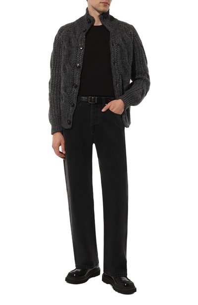 Кардиган с неравномерным окрашиванием и декоративными разрывами выполнили из меланжевой шерсти с добавлением нейлона. Модель дополнили двумя боковыми карманами.