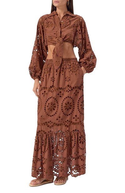 Асимметричный топ Echo выполнили из ажурного полухлопкового текстиля с волнообразным узором. Модель застегивается пуговицей на вырезе сзади.