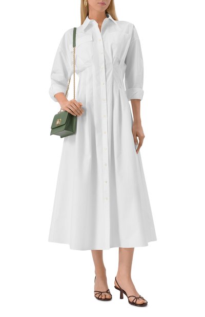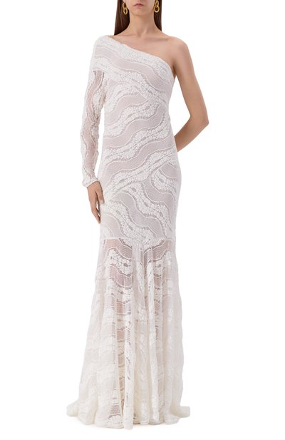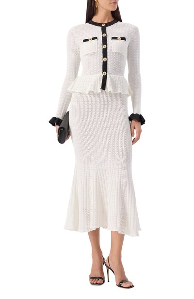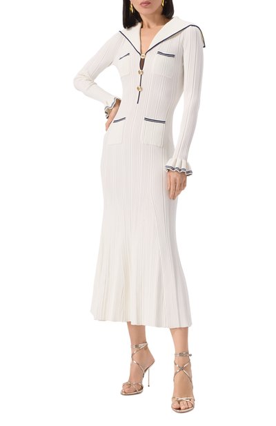 Миди-платье с глубоким декольте и отрезным лифом выполнили из сетчатого материала на основе хлопка. Модель дополнили подкладом, оставив рукава и часть подола полупрозрачными.