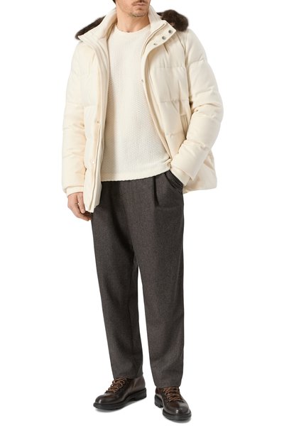 Для пошива пуховика с регулируемым капюшоном выбрали комбинацию вельвета и гладкого текстиля. Модель дополнили тремя карманами, а на рукавах предусмотрели паты. Изделие с подкладом из полиэстера застегивается молнией, скрытой под штормовой планкой на кнопках.