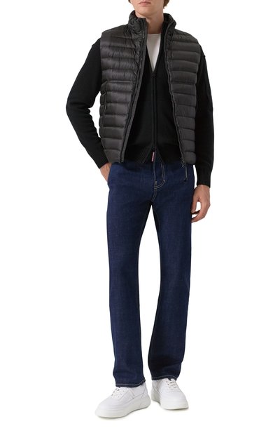 Стеганый утепленны й жилет сшили из жатого текстиля, укрепив встречную молнию лентами с шевронным мотивом. По бокам предусмотрели карманы и гладкие вставки, подчеркнув левую фирменным съемным патчем.