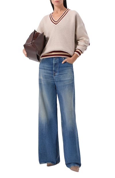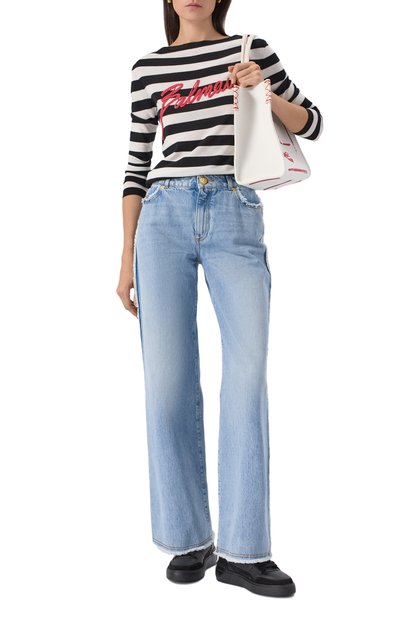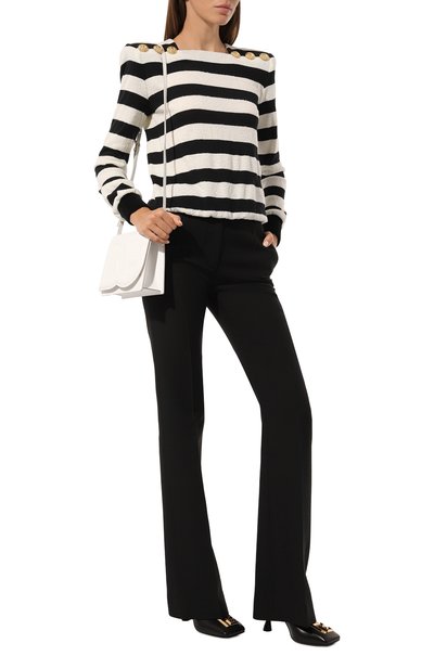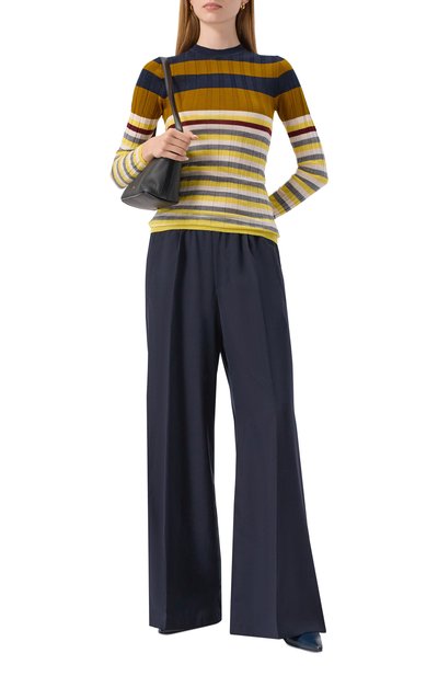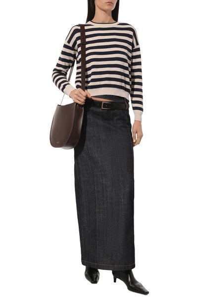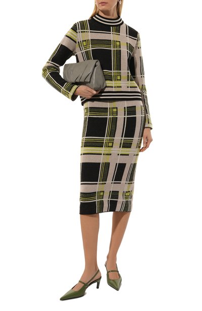 Пуловер с ромбовым узором дополнит total look с парной миди-юбкой. Для создания модели с однотонными ребристыми манжетами, поясом и круглой горловиной использовали хлопковый трикотаж. Внизу – вышитая эмблема Equestrian Knight Design.