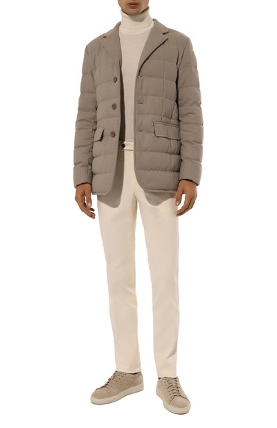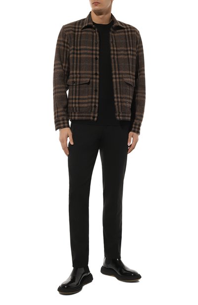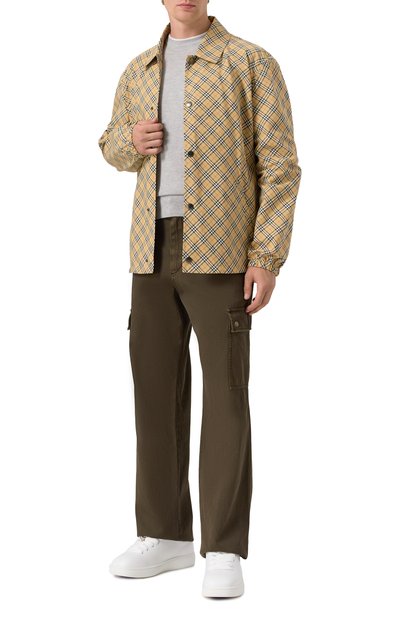 Двустороннюю куртку с эластичными регулируемыми манжетами выполнили из полиамида: однотонного и в клетку Burberry Check. На капюшоне и внизу предусмотрели кулиски, а по бокам – карманы. Одну из сторон декорировали резиновой эмблемой Equestrian Knight Design.