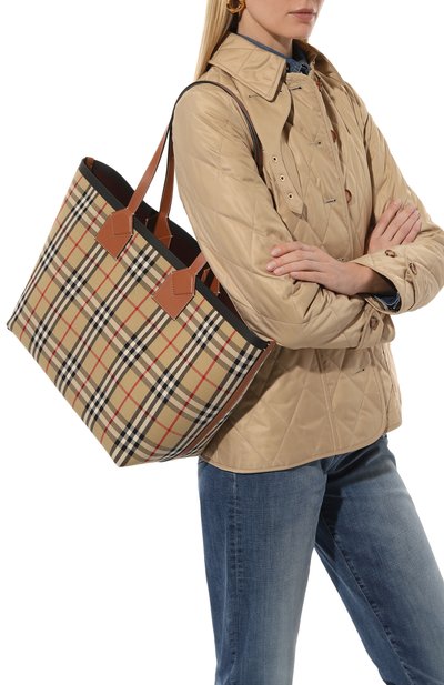 Сумку в клетку Burberry Check выполнили из полимера, а две длинные ручки и отделку — из телячьей кожи. Модель с внутренним карманом на молнии и карточным слотом дополнили съемным брелоком-зеркалом.
