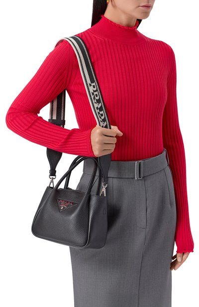 Сумку Studio с одной ручкой и съемным регулируемым ремнем выполнили из тисненой телячьей кожи. Аксессуар с поворотным золотистым замком Gancio дополнили карманом с молнией в одном из двух внутренних отделений.