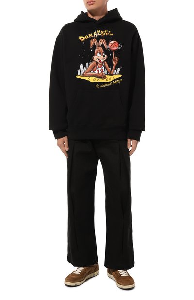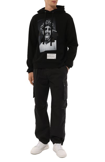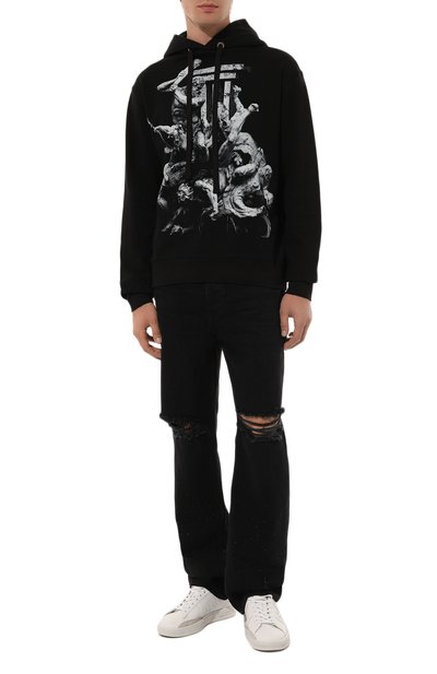 Для пошива худи с регулируемым капюшоном использовали хлопковый трикотаж. Модель с эмблемой марки на груди украсили фрагментом полотна Караваджо «Обращение Савла» спереди и описанием картины сзади.